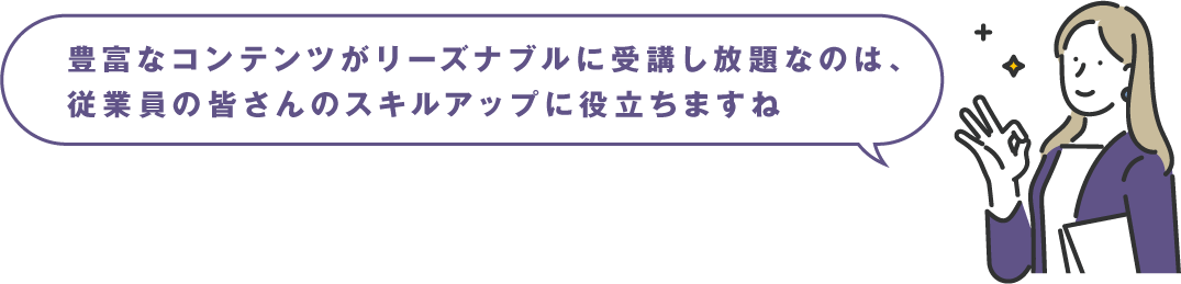 短期間かつ少人数からのご利用が可能です。また、教育担当者が不在なケースでの代理活用など、研修コストを抑えて、スキルアップやモチベーション向上にも直結させることができます。