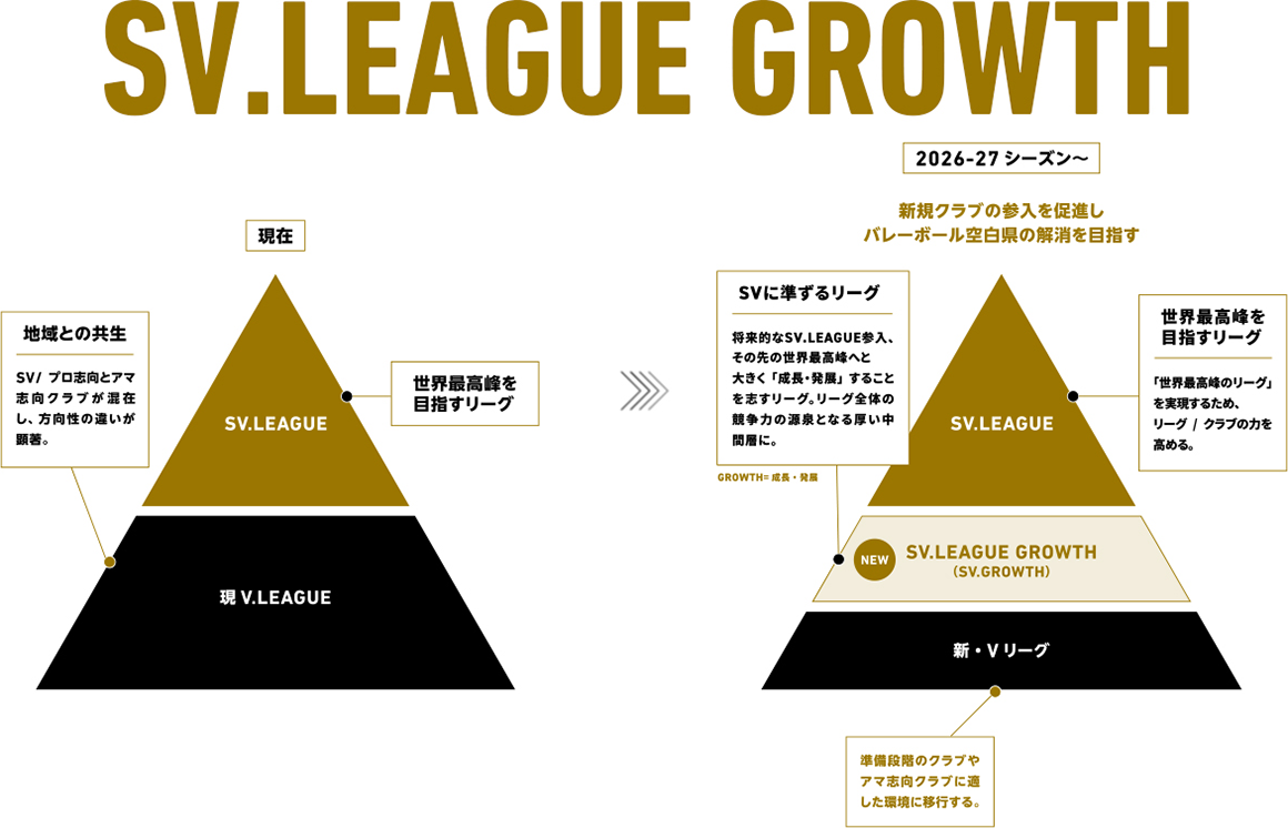 SVリーグはこうした志向性の違いを受け止め、各クラブが最適な環境で成長できるよう、リーグをさらに2つに再編し、SVリーグの下部リーグとして「SVグロース」を創設することを決定しました。